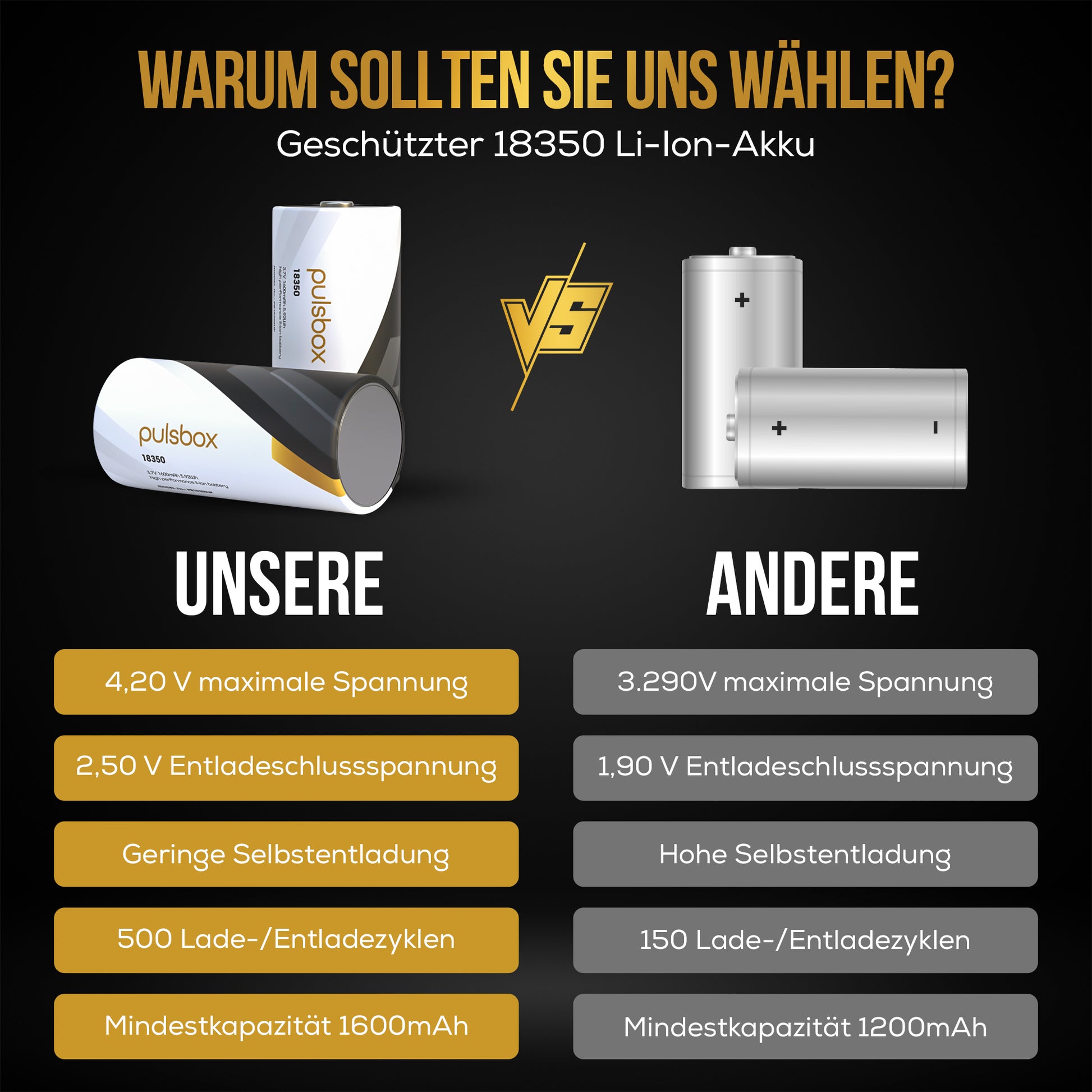 • Hohe Qualität: Der 18350 Li-Ion Akku wurde mit größter Sorgfalt gefertigt und bietet eine herausragende Lebensdauer.
