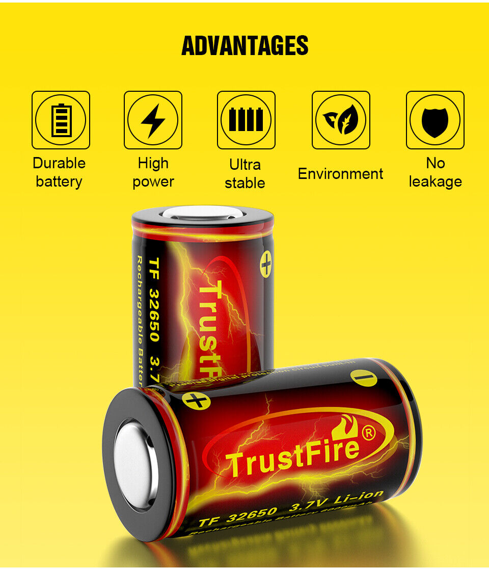 • Trustfire 32650 6000mAh 3.7V Protected li-ion Akku Integrierte PCB Schutz, Geschützt elektronisch gegen Über-, Unterspannung und gegen Kurzschluss und Verpolung geschützt. Anwendungsbereich: Taschenlampe, E-Zigarette, LED.
