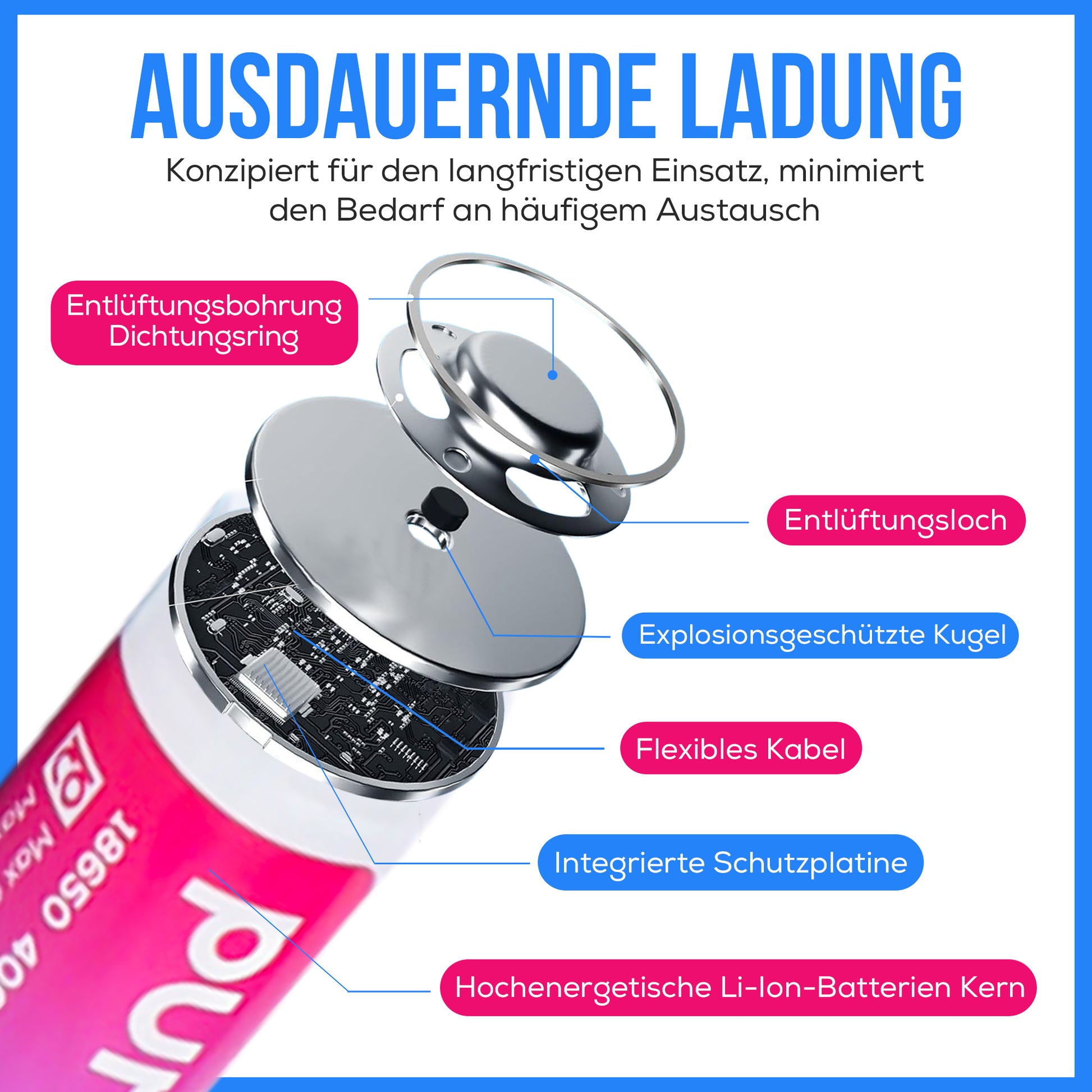 Entdecken Sie die geballte Power des PureUltra 18650 Li-ion Akku, die perfekte Lösung für all Ihre Geräte mit hohem Energiebedarf. Ob Taschenlampen, E-Zigaretten, Powerbanks oder andere Elektronik – dieser leistungsstarke Akku garantiert eine zuverlässige, langlebige und sichere Energieversorgung.